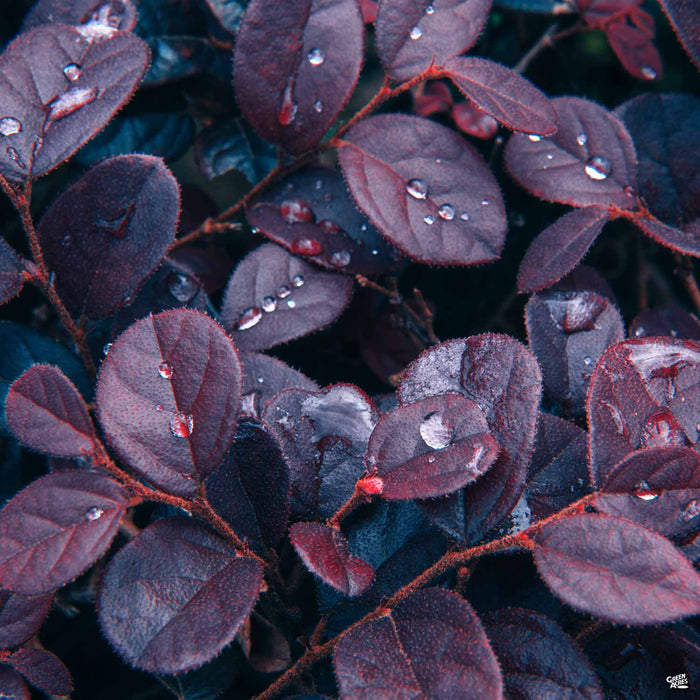 In spring, stunning red, fringed flowers adorn ornate evergreen shrub framed by dark purple foliage. Dark, plum colored foliage holds color throughout each season. Use as hedge or accent plant.