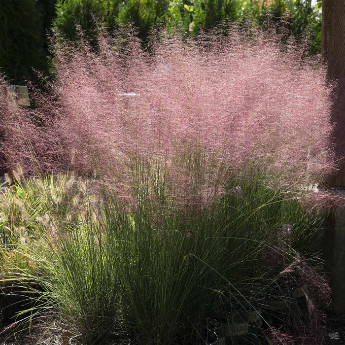 Tall, delicate, dark pink, feathery plumes rise above foliage from late summer into fall. Also known as "cotton candy grass". Use in containers or poolside.