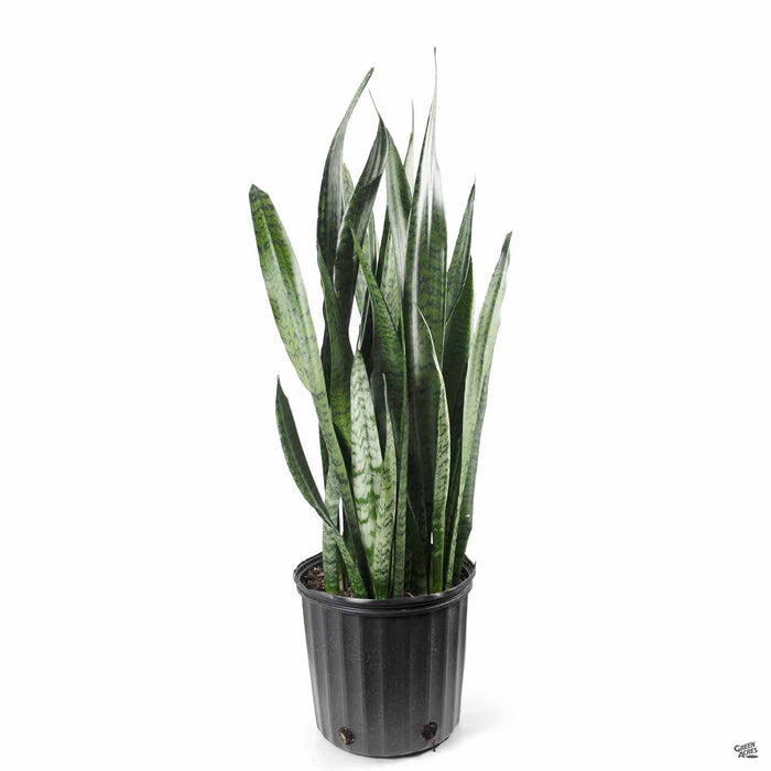 Also known as "Mother-in-Law's Tongue", has dark, upright, sword-like leaves variegated with white. Drought tolerant and air purifier is a beginner houseplant.