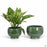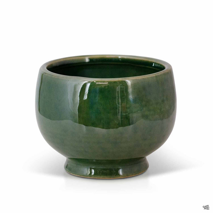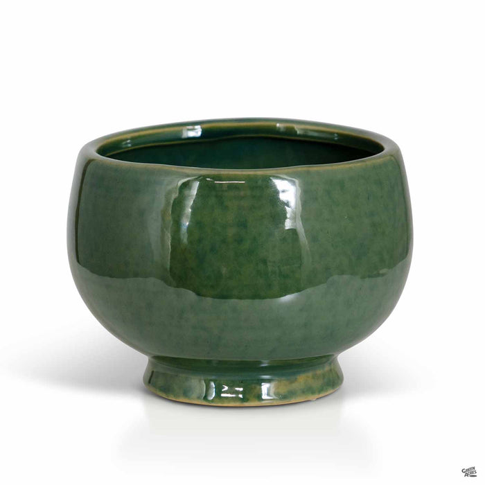 Ceramic indoor pottery with wide bowl shape and footed pedestal. Rich jade colored glaze compliments natural indoor decor. Plants sold separately.