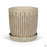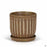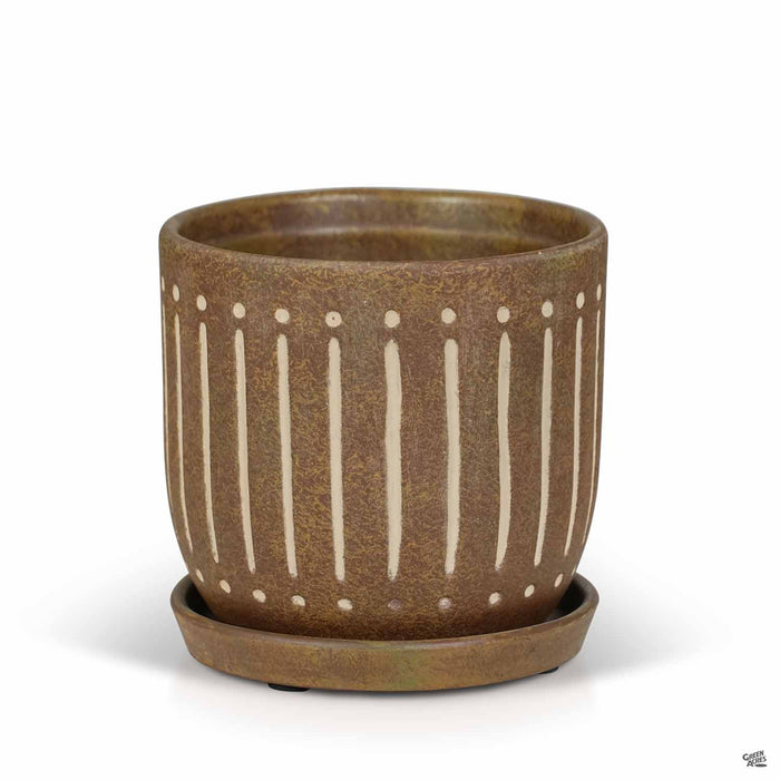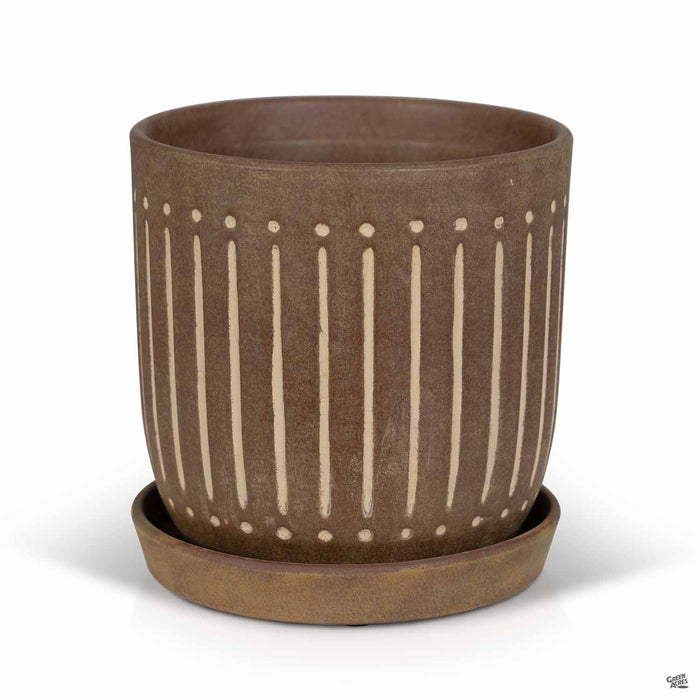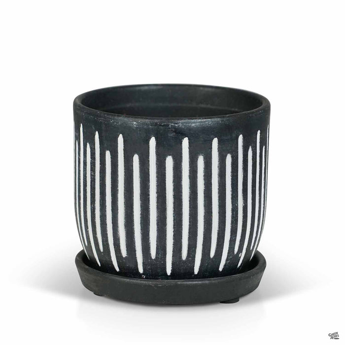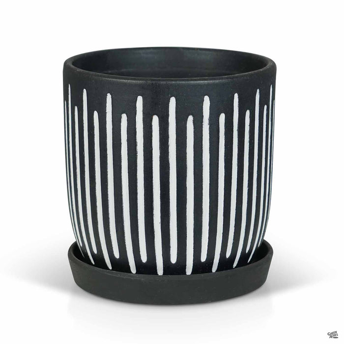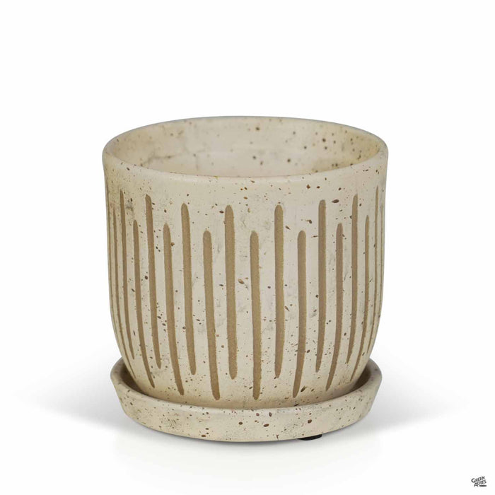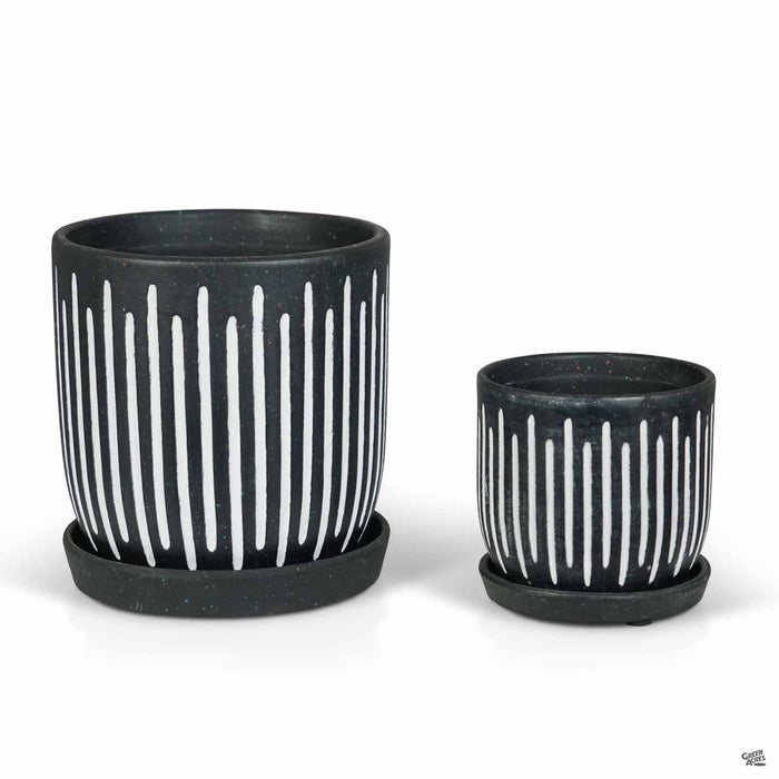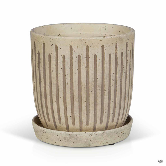 Ceramic indoor pottery with etched vertical lines and two-tone glaze. Available in three colors and two sizes. Plants sold separately.