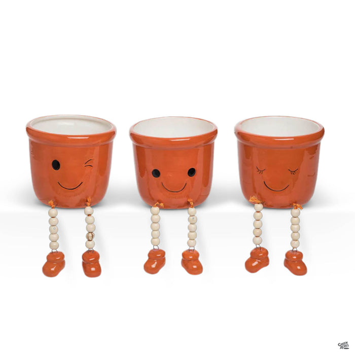 These charming pots include beaded legs that dangle over shelf edges. Happy smiling faces light up a room and compliment any small houseplants or succulents. Plants sold separately.