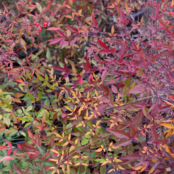 Evergreen shrub has a compact, dense growth habit. Green, lacy leaves turn reddish-purple in sunny or cold weather. Small white flowers appear in spring or summer, followed by sprays of red berries. Use as semi-opaque screen, hedge, or accent plant.