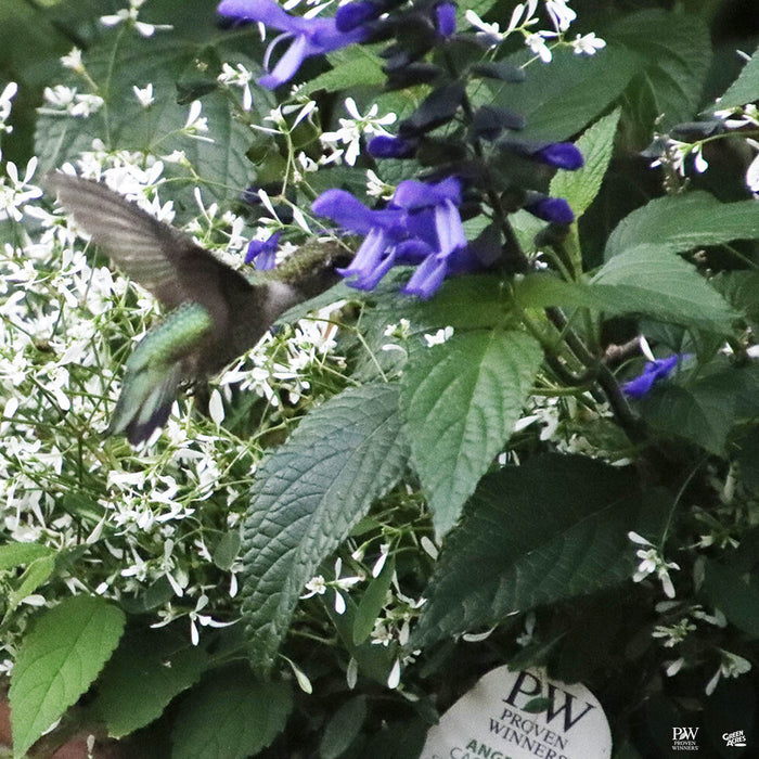 Large, dark blue flowers open high above lush, deep green leaves. Blooms constantly from early spring until frost. Compact habit lends well to containers and borders.